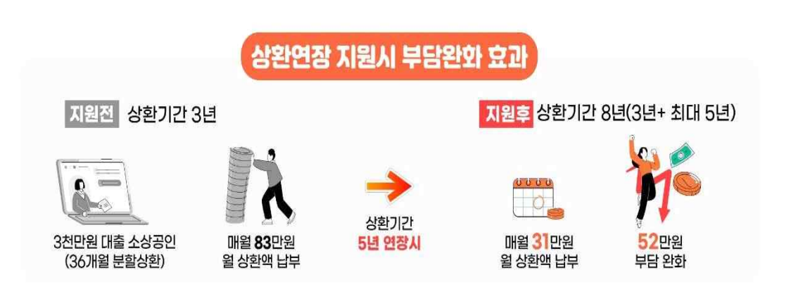 상환연장이 결정되면, 최대 5년(60회차)까지 분할 상환기간이 추가로 주어집니다. 예를 들어, 원래 3년 동안 갚아야 할 돈을 8년에 걸쳐 갚을 수 있게 되는 거죠. 이렇게 되면 매월 갚아야 할 금액이 크게 줄어들게 됩니다.